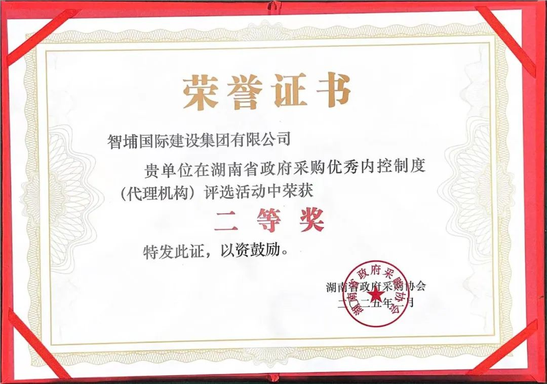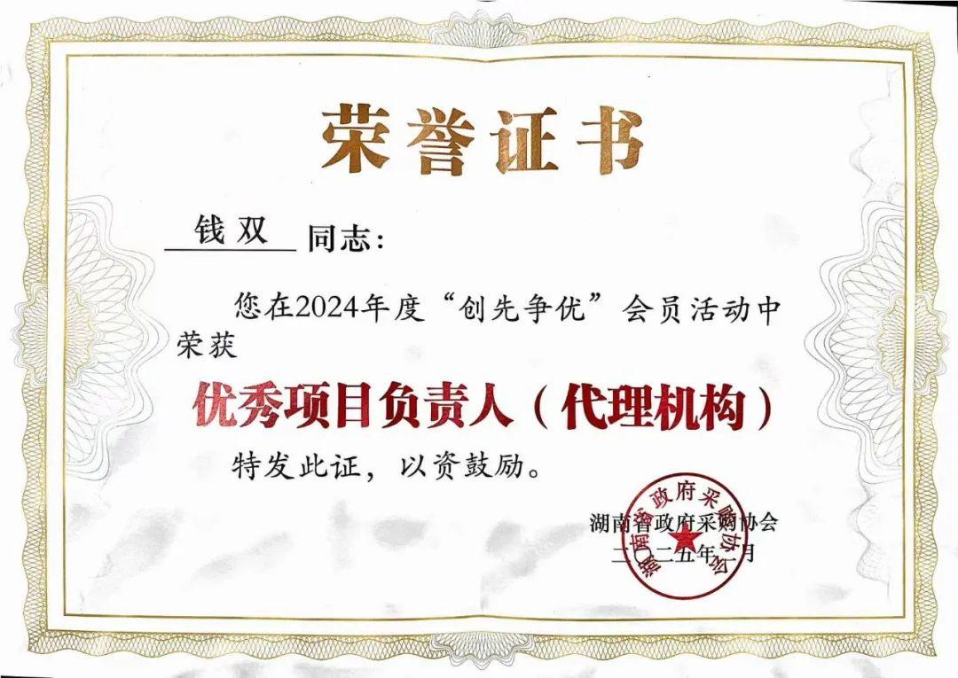 近日,在湖南省政府采購協會主辦的2024年度“創先爭優”會員活動和優秀內控制度評選中,智埔國際建設集團憑借卓越的代理服務能力與科學規范的內控管理,榮獲“湖南省政府采購協會優秀代理機構”及“湖南省政府采購優秀內控制度二等獎”兩項大獎。同時,我司項目團隊的杰出代表錢雙同志,以其卓越的專業水平和出色的工作能力,被評為“2024年度湖南省政府采購優秀項目負責人”。