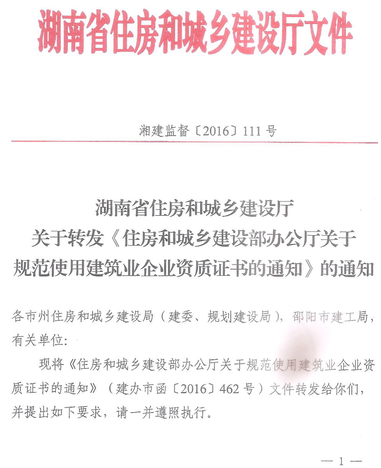 湖南省住房和城鄉建設廳關于轉發《住房和城鄉建設部辦公廳關于規范使用建筑業企業資質證書的通知》的通知